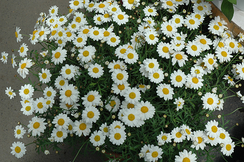 Madeira™ White Marguerite Daisy has masses of beautiful white daisy flowers with yellow eyes at the ends of the stems from late spring to early fall, which are most effective when planted in groupings. The flowers are excellent for cutting. Its tiny deeply cut ferny leaves remain dark green in color throughout the season.
