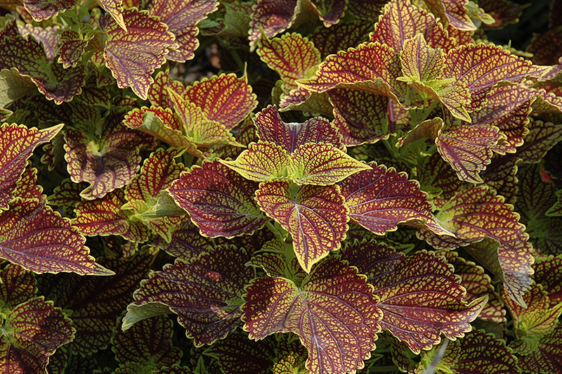 Coleosaurus Coleus' attractive serrated pointy leaves remain chartreuse in color with distinctive burgundy veins and tinges of light green throughout the year on a plant with an upright spreading habit of growth.