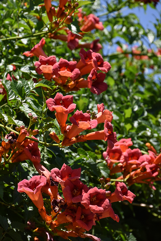 Summer Jazz™ Fire Trumpetvine features bold clusters of red trumpet-shaped flowers with orange overtones at the ends of the branches from late spring to early fall. It has dark green deciduous foliage. The serrated pointy pinnately compound leaves turn yellow in fall.