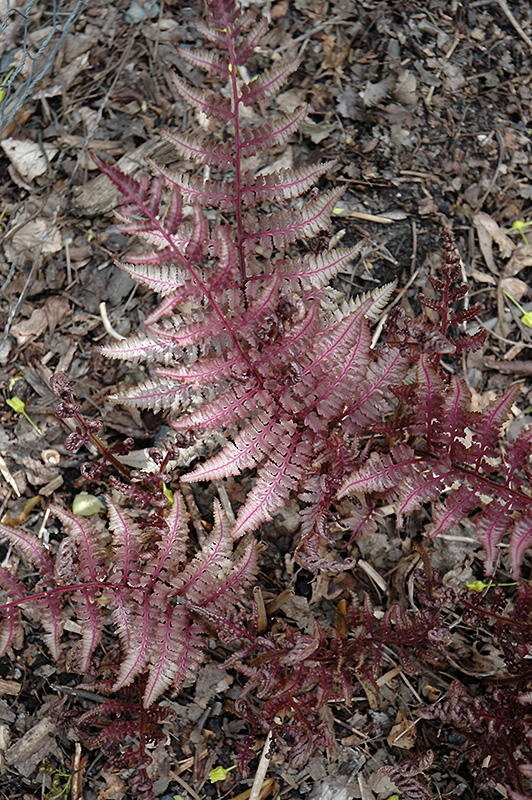 Burgundy Lace Painted Fern will grow to be about 16 inches tall at maturity, with a spread of 18 inches. Its foliage tends to remain dense right to the ground, not requiring facer plants in front. It grows at a slow rate, and under ideal conditions can be expected to live for approximately 15 years. As an herbaceous perennial, this plant will usually die back to the crown each winter, and will regrow from the base each spring. Be careful not to disturb the crown in late winter when it may not be readily seen!