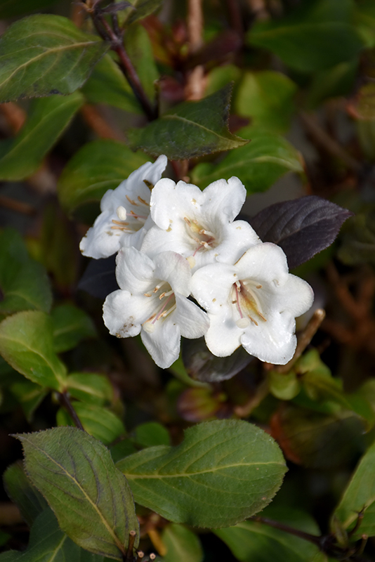 Wine & Spirits® Weigela features showy clusters of white trumpet-shaped flowers along the branches from late spring to early summer, which emerge from distinctive light green flower buds. It has attractive burgundy-variegated dark green foliage. The pointy leaves are highly ornamental and turn an outstanding deep purple in the fall. The smooth gray bark and dark red branches add an interesting dimension to the landscape.