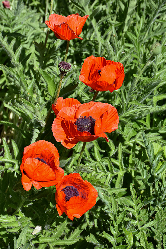 Crimson Red Poppy will grow to be about 24 inches tall at maturity, with a spread of 24 inches. When grown in masses or used as a bedding plant, individual plants should be spaced approximately 14 inches apart. It grows at a fast rate, and under ideal conditions can be expected to live for approximately 5 years. As an herbaceous perennial, this plant will usually die back to the crown each winter, and will regrow from the base each spring. Be careful not to disturb the crown in late winter when it may not be readily seen! As this plant tends to go dormant in summer, it is best interplanted with late-season bloomers to hide the dying foliage.
