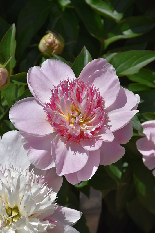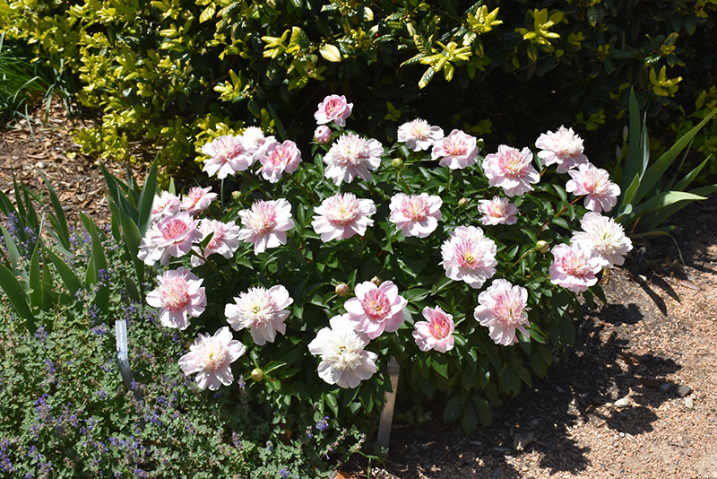 Do Tell Peony features bold lightly-scented semi-double shell pink flowers with white overtones and rose streaks at the ends of the stems from late spring to early summer. The flowers are excellent for cutting. Its compound leaves remain green in color throughout the season.
